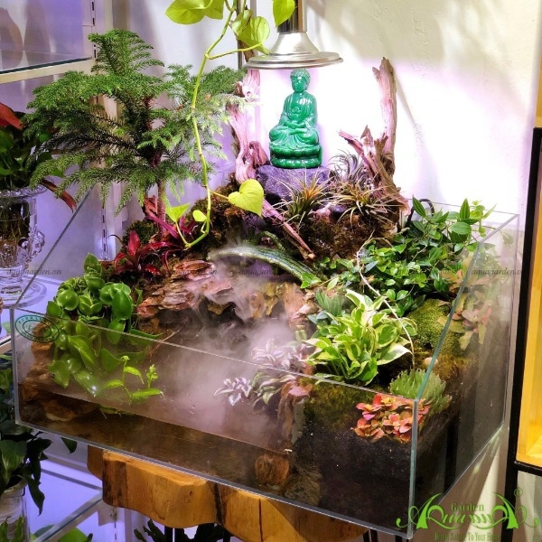 - Vật liệu trang trí: Đá, gỗ lũa, rễ cây, mô hình hang động, thác nước.