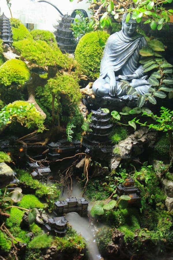 Tạo dựng một khung cảnh bí ẩn và đầy khám phá. Các khối đá được sắp đặt tinh tế, kết hợp cùng ánh sáng và cây rêu, giúp tạo chiều sâu và cảm giác như bước vào thế giới khác.