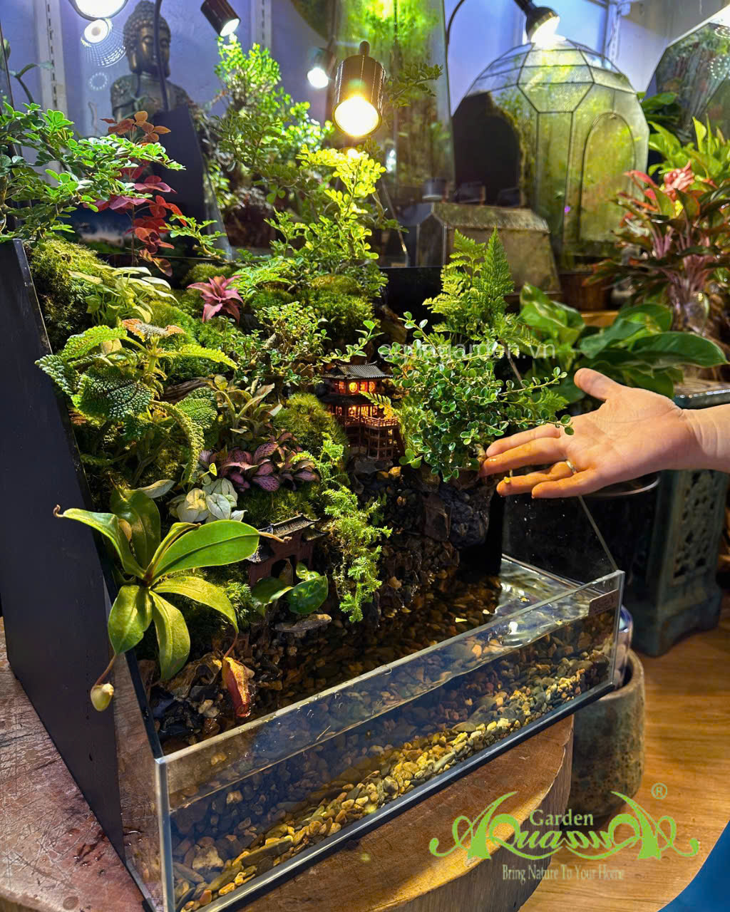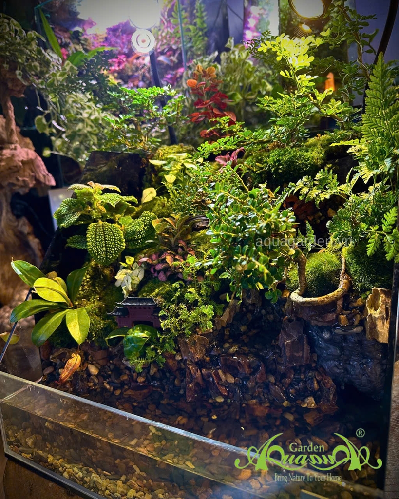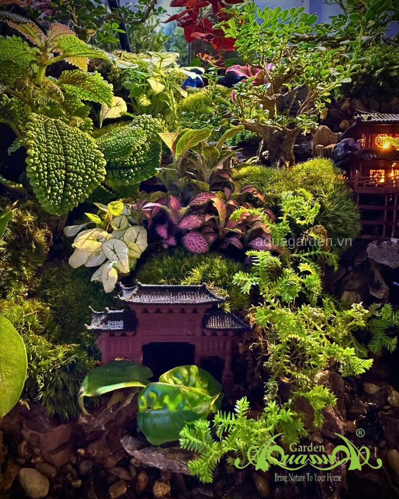 Không gian cây xanh đa tầng – từ rêu, dương xỉ đến cây lá màu, tạo chiều sâu và sự sống động.