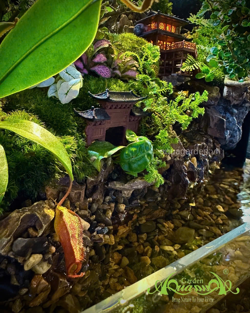 Trong nhịp sống hối hả của phố thị, việc tìm cho mình một góc bình yên để tĩnh tâm là điều ai cũng mong muốn. Với tác phẩm Tịnh cư sơn thôn, AquaGarden mang đến một hồ bán cạn đặc biệt, tái hiện hình ảnh ngôi làng nhỏ ẩn mình giữa rừng xanh, nơi ánh sáng ấm áp hòa cùng sắc xanh tươi mát.