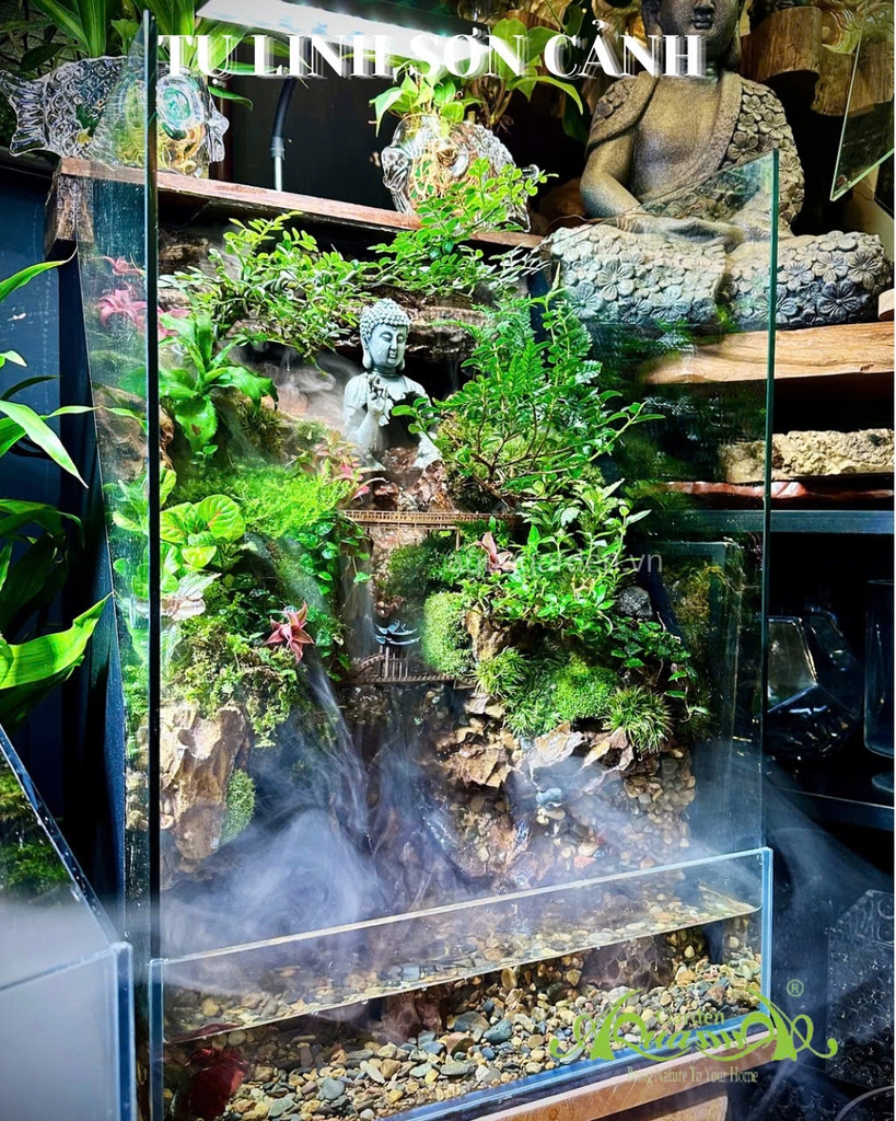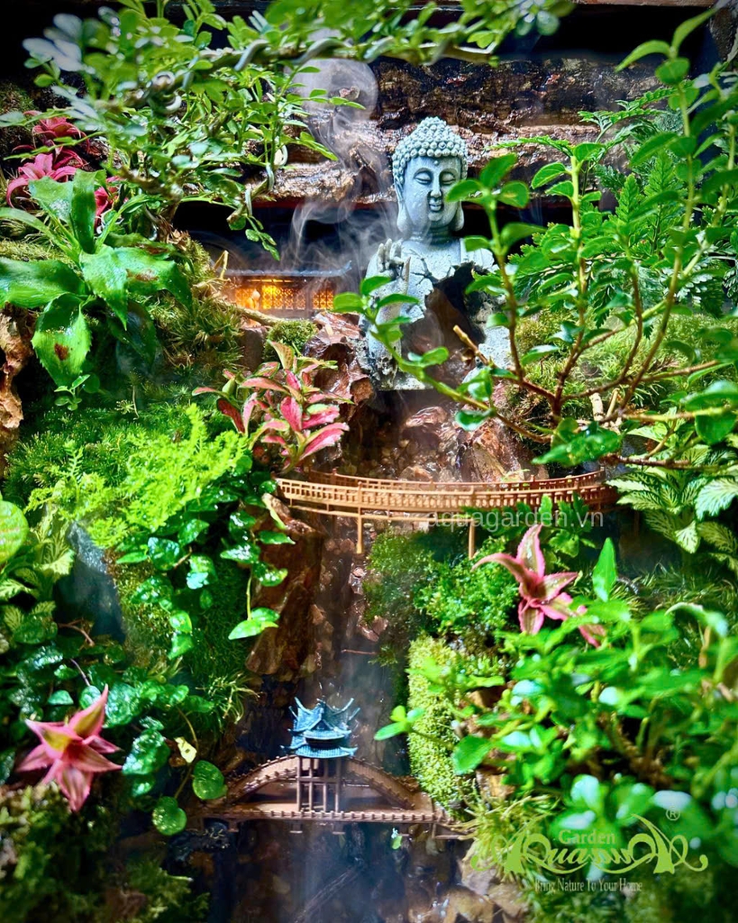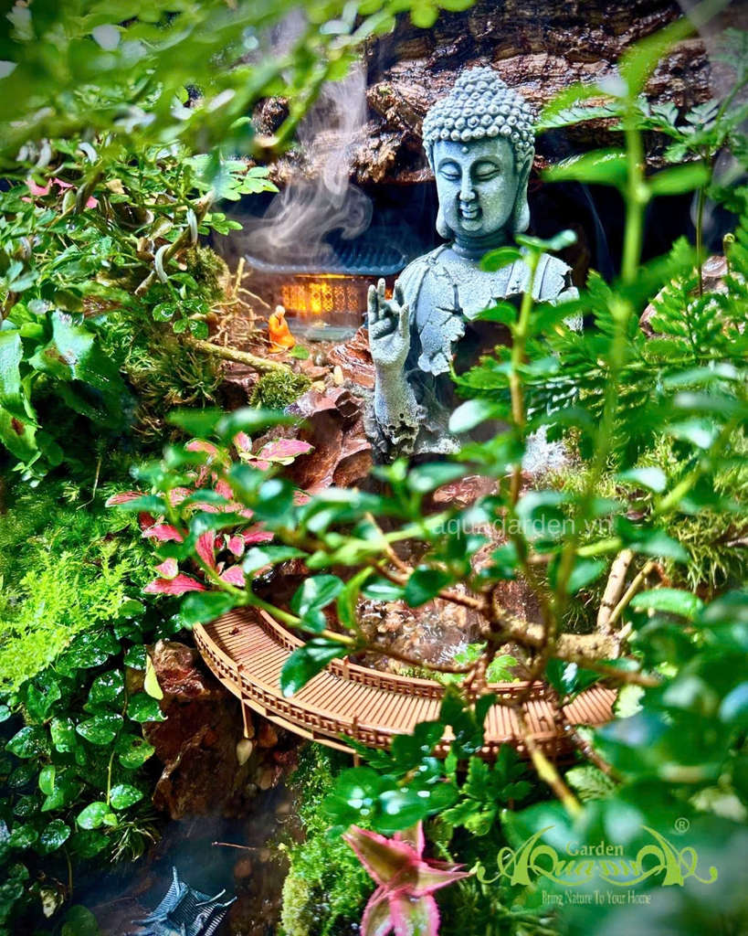 Điểm nhấn của tác phẩm chính là tượng Phật thiền định đặt giữa khu rừng thu nhỏ. Tượng mang đến cảm giác bình yên, tĩnh tại và gợi mở năng lượng an lành. Bao quanh là những mảng xanh đa tầng: từ rêu phủ mềm mại, dương xỉ tươi mát đến những cây lá màu điểm xuyết sinh động.