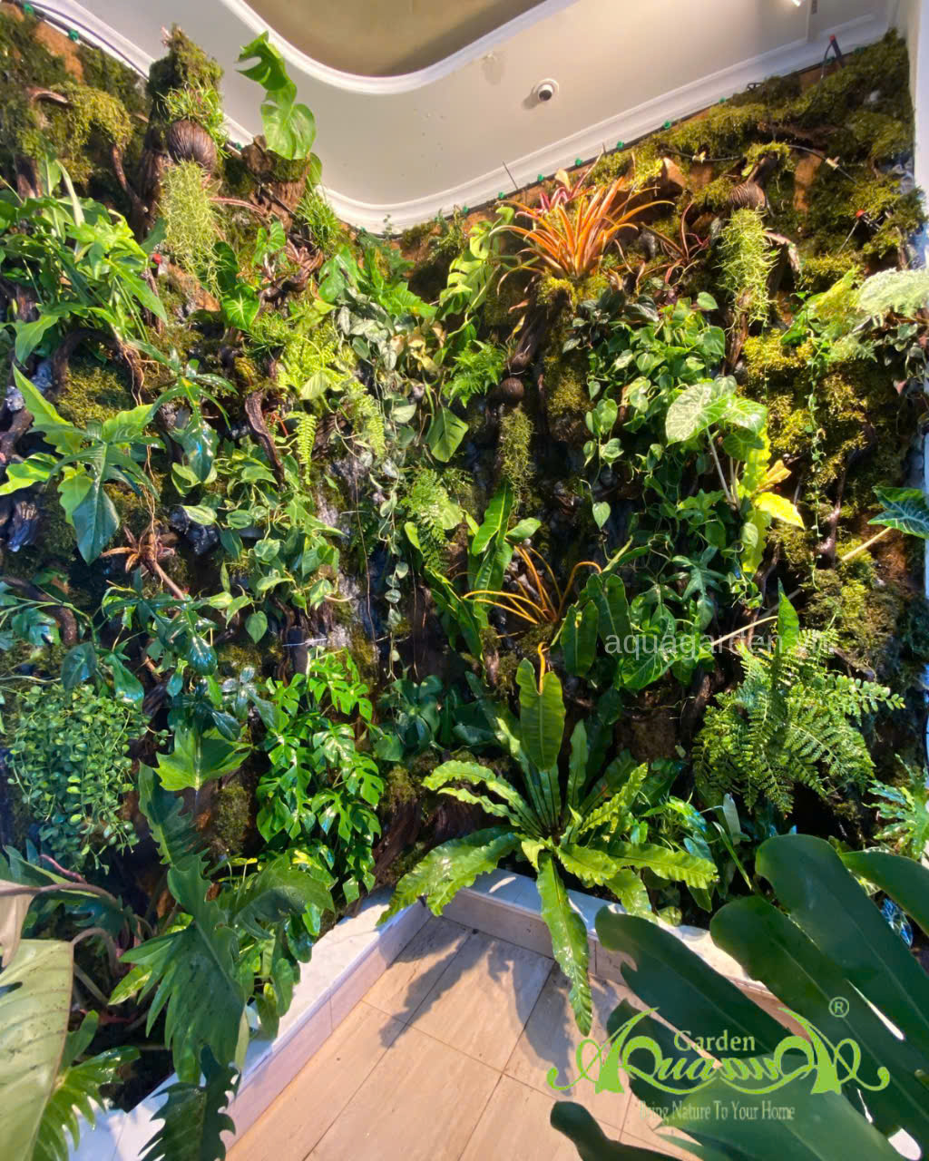 AquaGarden thực hiện công trình mảng tường rừng cây nhiệt đới với kích thước theo yêu cầu, kết hợp nhiều loại cây nhiệt đới, hệ thống phun sương & đèn quang hợp tự động, mang lại không gian xanh mát và sang trọng.