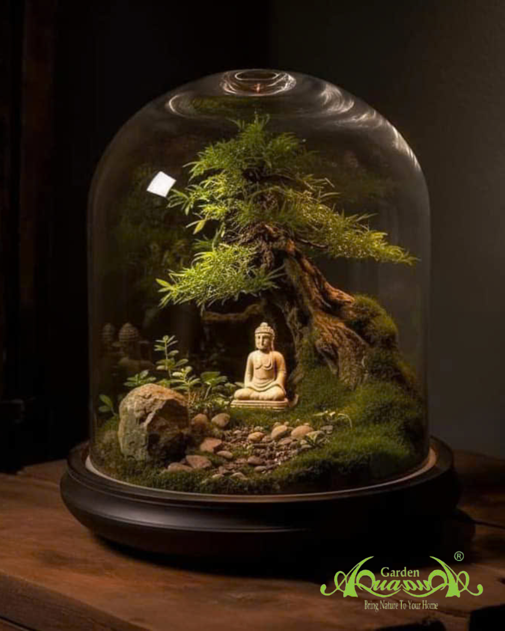 Liễu Sơn Tự là một terrarium mang phong cách thiền định cổ kính, gói trọn trong lòng chiếc lồng kính là cả một cõi tĩnh lặng – nơi thiên nhiên và tâm linh gặp nhau trong sự yên bình tuyệt đối.
