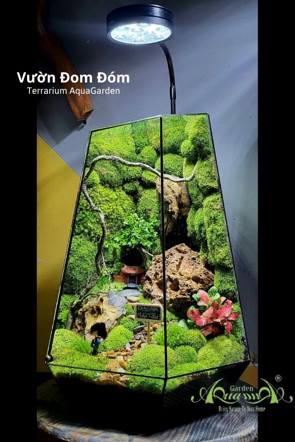Tác phẩm Terrarium "Vườn đom đóm" sở hữu một vẻ đẹp độc trong chiếc Thủy tinh Đa giác. Layout tác phẩm vừa phức tạp, vừa đơn giản dành cho ai đang cân nhắc tìm một 'khu vườn' thú vị để bàn làm việc hoặc tặng đối tác,..