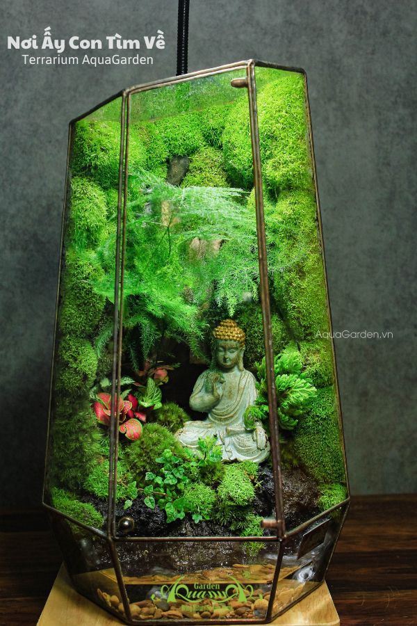 Kết hợp với tượng Phật thêm phần thanh nhã, yên bình. Chiếc Terrarium gợi nhắc ta đi tìm về cội nguồn, tự nhiên - nơi bình yên chính là chân ái.