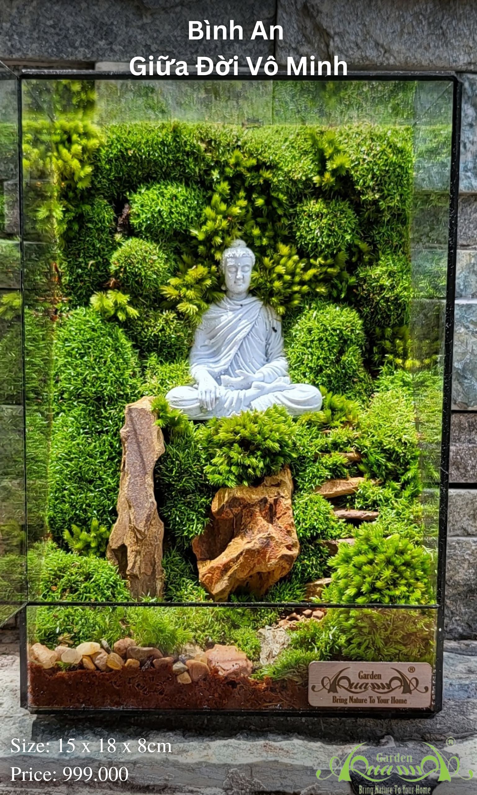 Tác phẩm Terrarium chủ đề Phật giáo luôn được ưa chuộng tại AquaGarden. Và đây, "Bình an giữa đời vô minh" là một hình ảnh đẹp đẽ giữa sự sống tự nhiên và kết nối tới trạng thái, an lạc, tĩnh lặng giữa những xô bồ, phức tạp của cuộc sống. Để đạt được sự bình an này, người ta thường nhấn mạnh việc tu dưỡng, rèn luyện từ bên trong.