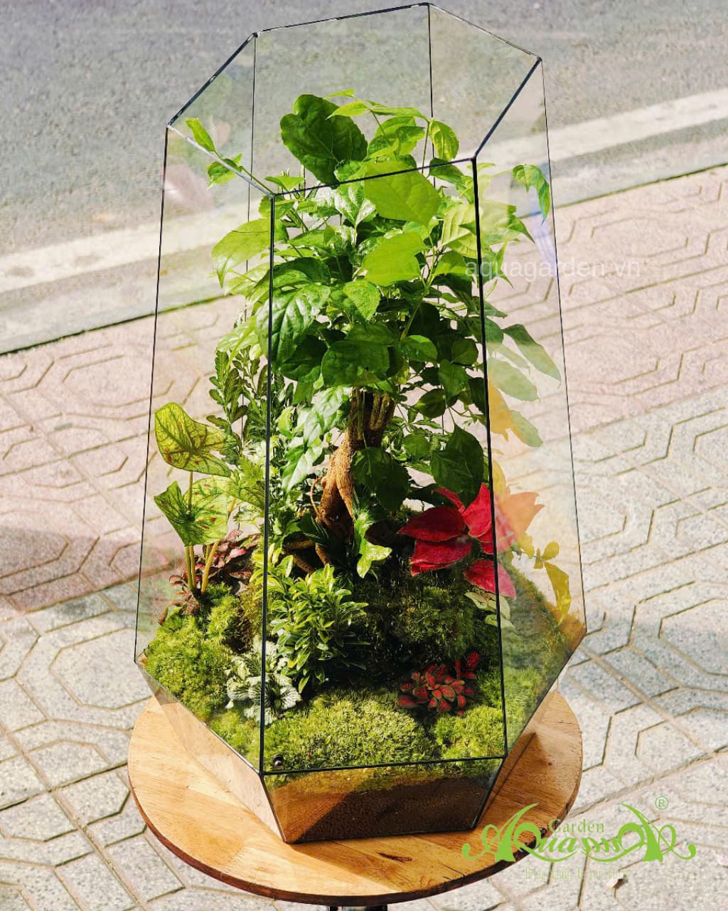 Terrarium này được thiết kế trong một chiếc lồng kính hiện đại với các mặt vát tinh tế, cho phép ánh sáng tràn ngập và phản chiếu vẻ đẹp của từng chi tiết bên trong. Blooming Serenity không chỉ là một tác phẩm trang trí, mà còn là một không gian sống xanh thu nhỏ, mang lại cảm giác thư giãn và kết nối với thiên nhiên mỗi khi ngắm nhìn.