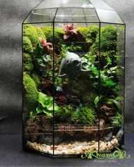 Bên trong chiếc terrarium, rêu xanh mướt và các loại cây nhiệt đới tạo nên một khung cảnh tự nhiên sống động, mềm mại như những giai điệu. Những cành dây leo đan xen, cùng lớp đá tự nhiên và sỏi, tạo nên sự hài hòa giữa yếu tố hoang dã và nghệ thuật sắp đặt. Ánh sáng phản chiếu qua lớp kính trong suốt, làm nổi bật từng chi tiết và tạo hiệu ứng như dòng nước lặng lẽ chảy qua.