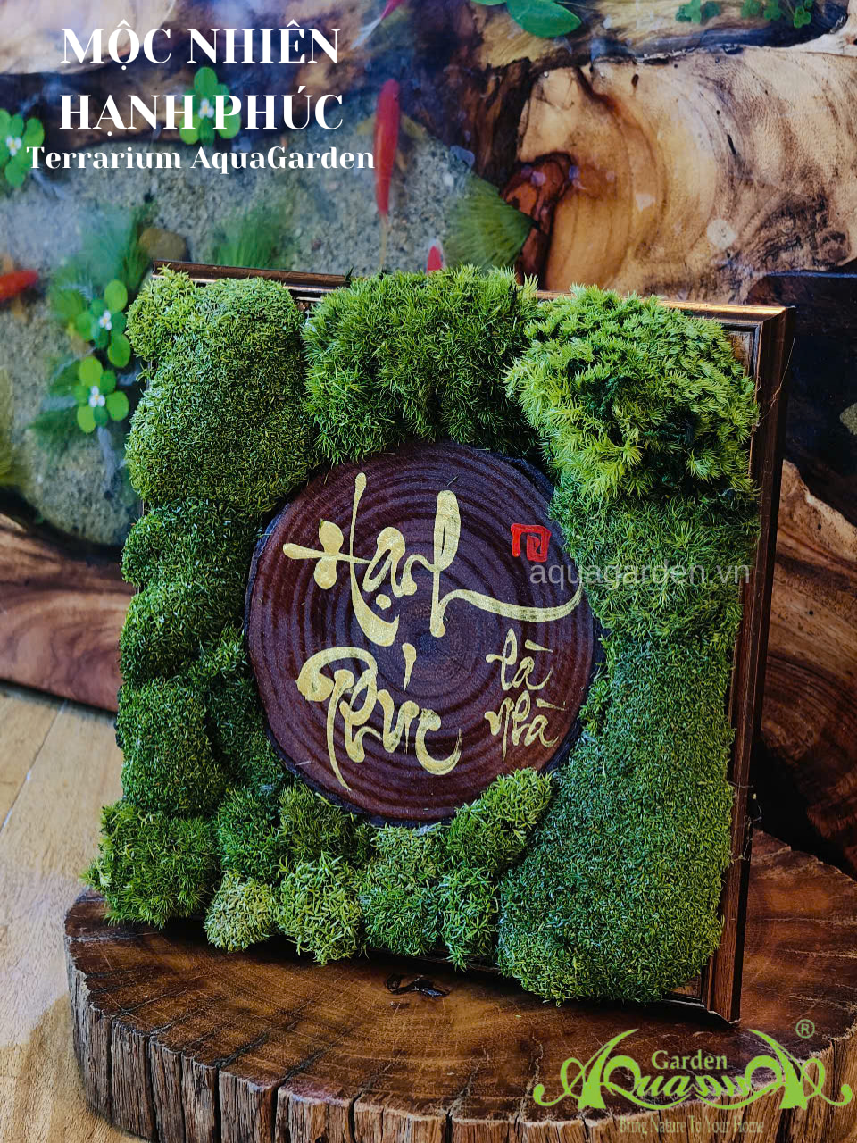 Bao quanh vòng gỗ là lớp rêu xanh mượt, tựa như tấm áo của mẹ thiên nhiên, lan tỏa sức sống mãnh liệt. Mỗi cụm rêu được sắp xếp một cách tự nhiên nhưng đầy dụng ý, tạo nên chiều sâu và sự chuyển động mềm mại. Rêu xanh không chỉ là vật liệu mà còn là linh hồn của bức tranh, gợi lên cảm giác tươi mới và thuần khiết, như bước vào một khu rừng thu nhỏ.