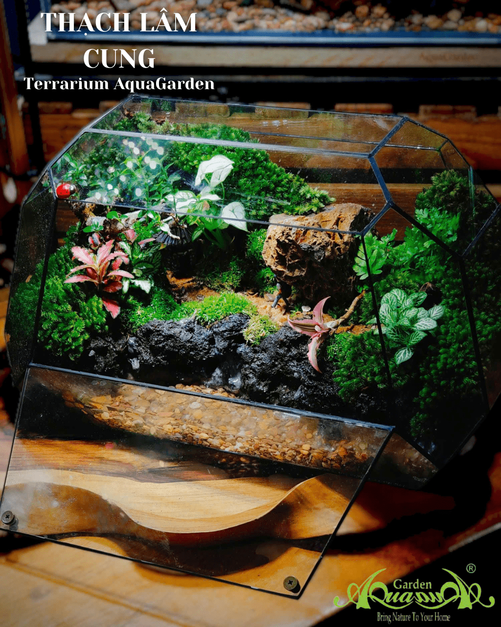 Không chỉ là món decor, Thạch Lâm Cung là “cánh cổng” dẫn về với thiên nhiên – nơi mỗi chi tiết đều kể một câu chuyện của rừng già, của đất, đá và sự sống. Thiết kế độc đáo với hệ sinh thái khép kín, dễ chăm sóc, phù hợp đặt tại bàn làm việc, phòng khách hay góc thư giãn. Terrarium này không chỉ làm đẹp không gian sống, mà còn là “khoảnh khắc dừng lại” giữa nhịp sống hiện đại. Sản phẩm thủ công, giới hạn số lượng – mỗi chiếc Thạch Lâm Cung là một phiên bản duy nhất, chứa đựng tâm huyết hơn 20 năm của AquaGarden trong việc đưa thiên nhiên vào lòng thành phố.