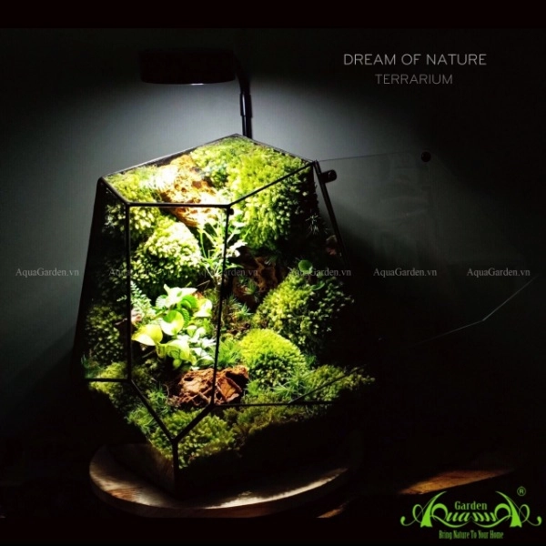 Terrarium là một hệ sinh thái thiên nhiên thu nhỏ, không có lỗ thoát nước, lồng vào là các mảng thực vật, các cây chịu ẩm.